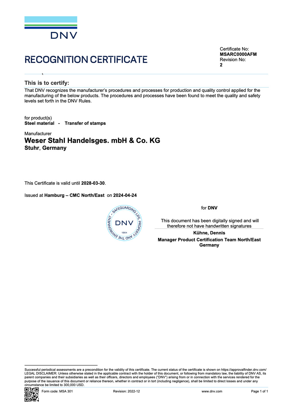 DNV-Zertifikat Werkstoffkennzeichnung